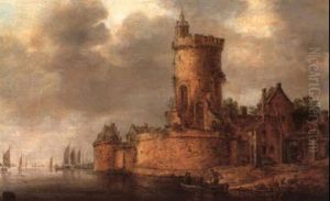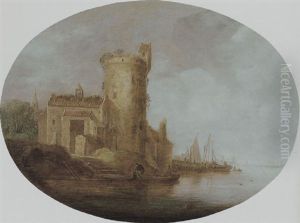 A River Landscape With Fishermen Hauling In Their Nets Before A Castle
