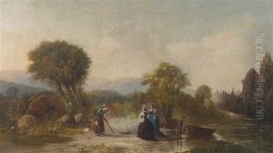 A River Landscape With Elegant Figures Being Ferried In A Punt By A Castle