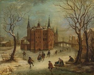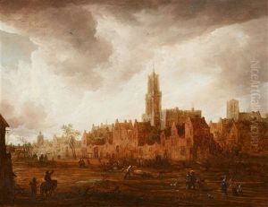 A Winter River Landscape With Figures On The Outskirts Of A Village, A Town Beyond