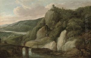 A Mountainous Landscape With A Three-horse Cart In The Foreground, Travellers Beside A Bridge And A Clifftop Town Beyond
