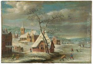 A Winter Landscape With Figures By A Frozen River In A Village
