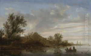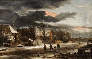 A village scene in winter with peasants by a river