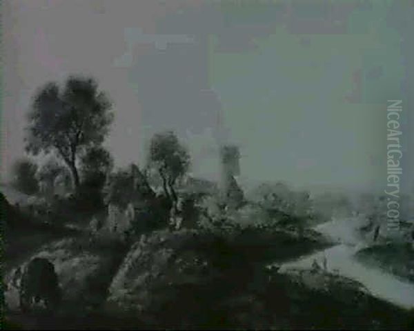 Peasants Travelling On A Sandy Path With A Windmill And A River Beyond