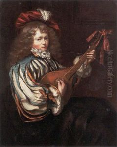 A Young Boy In A Feathered Red Cap Playing The Mandolin