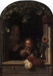A Boy Blowing Bubbles In A Window, Behind Him A Woman With A Dog