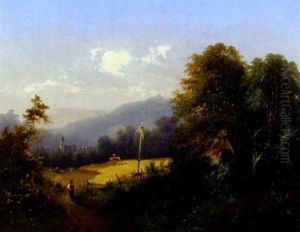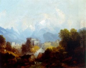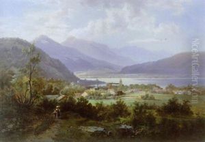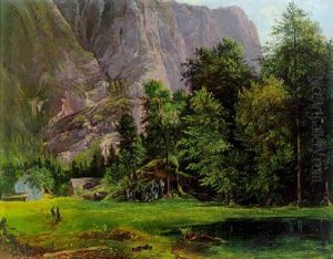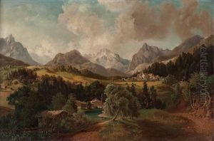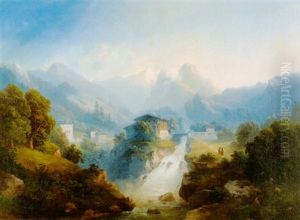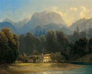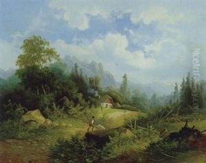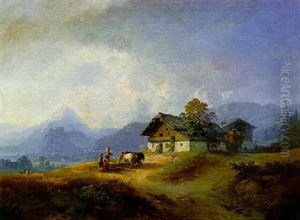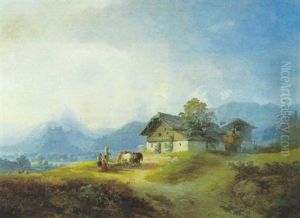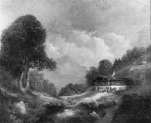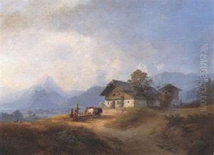 Gebirgslandschaft Mit Bauernhausern Und Figurlicher Staffage