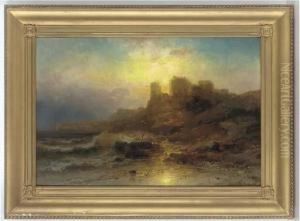 German Coastal View With Figures Near A Lighthouse And A Distant Steam Ship