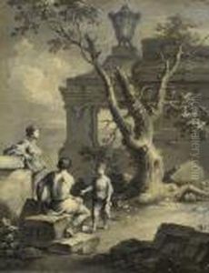 A Capriccio Landscape With Figures Resting By The Ruins Of A Classical Tower, A River And A Mountain Beyondd