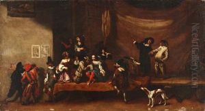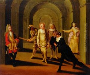Numerous Figures Gathered At A Commedia Dell'arte With Ruined Buildings Beyond