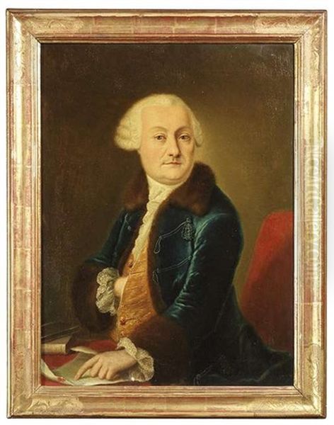 Bildnis Eines Fein Gekleideten Herren An Einem Tisch Mit Buchern Auf Ein Dokument Deutend