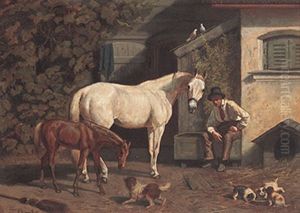 Landliche Idylle Auf Einem Gut, Auf Dem Vorplatz Stute Mit Fohlen Und Hundin Mit Welpen