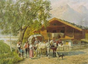 Des Reiters Rast Bei Der Sennerin Vor Der Almhutte