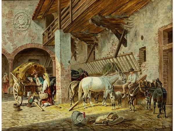 Ansicht Eines Italienischen Gehofts Mit Stallungen, Personen, Pferd Und Eseln