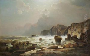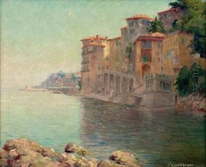 Two Friars At The Capuchin Cloister's Patio, In The Background View Of Coast And Bay At Amalfi. Oil/panel, Signed