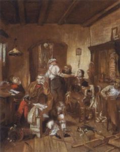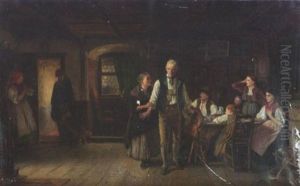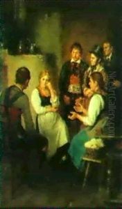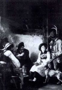 In Einem Wirtshaus Eine Gruppe Von Jagern Im Gesprach Mit Drei Madchen