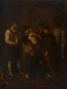 Der Stellungsbefehl. Im Inneren Eines Alten Gehoftes Uberreicht Ein Alter Feldwebel Dem Jungbauern Den Stellungsbefehl