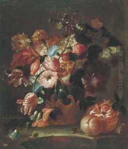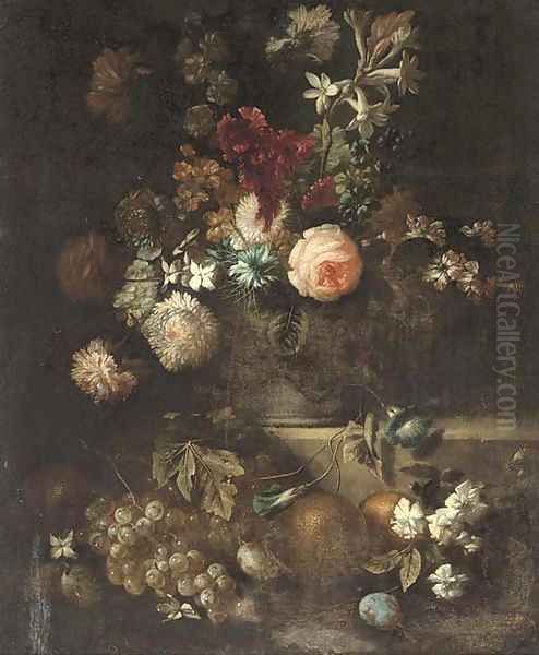 Roses, narcissi, morning glory and other flowers in a vase on a ledge with grapes, plums and oranges beneath
