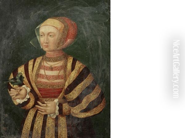 Portrait Of A Lady, Three-quarter-length, In A Gold And Burgundy Dress, Holding A Bird