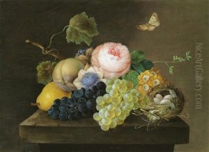 A Still Life Of Flowers With Fruits And A Bird Nest