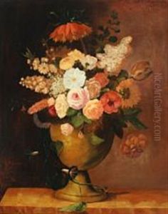 An Iris, Roses, Auriculas And Other Flowers In An Urn On A Stone Ledge, With A Butterfly