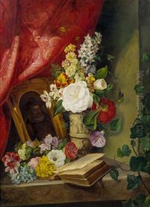 Roses, Peonies, Irises, Violets, And Other Blossoms In A Terracotta Urn, And Grapes, Blackcurrants And A Peach On A Table