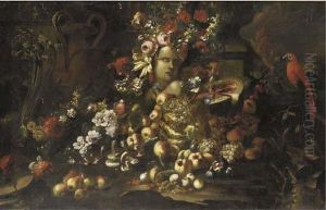 A still life of roses, hydrangeas, poppies and other flowers in an urn with an African Grey parrot, grapes, peaches and walnuts on a marble ledge