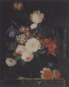 Tulips, Carnations, Wild Roses, Irises And Chrysanthemums In An Urn On A Ledge
