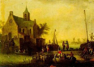 A River Landscape With Peasants Embarking On A Ferry, A Castle With A Hilltop Beyond