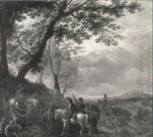 Hilly Landscape With Figures And Soldiers Resting Beside A Tree