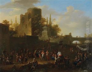 A Wooded Landscape With Soldiers And Other Figures Resting, With A Classical Tomb Beyond