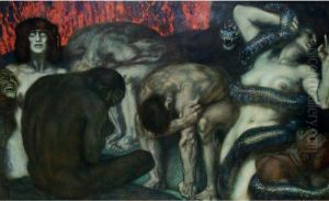 Von Stuck gained notoriety for his works that often focused on themes of mythology, sin, and human folly. He is particularly known for his striking and eroticized depictions of female figures from mythological contexts, such as 'The Sin' (1893), which depicts a naked woman with a serpent, symbolizing temptation and the original sin.