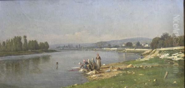 Lavandieres En Bord De Seine Au Trou Du Moulin Pris De Carrieresous Bois Huile Sur Toile