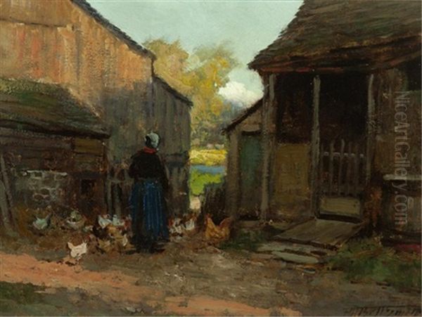 Feeding Chickens Oil Painting by Frederic Marlett Bell-Smith