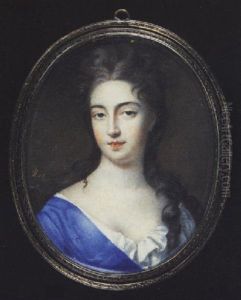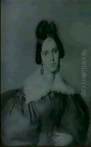 A Young Lady, In Off-the-shoulders Blue Dress With White Puff Sleeves, Brown Hair Elaborately Dressed In An Apollo Knot Secured With A Tortoiseshell Comb