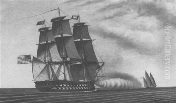 The Ship Of The Line "delaware" Flying An American 22-star Flag And Firing On An Algerian Fulacca While In The Mediterranean
