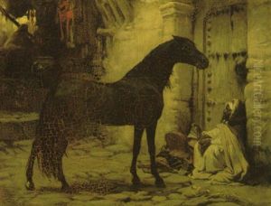 Chevaux S'abreuvant A La Fontaine Sur Une Place