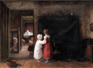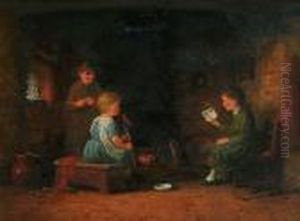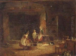 Cottage Interior With Children Seated Beside A Fire Place