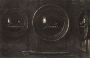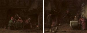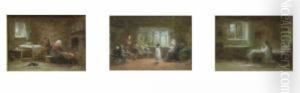 Three Oils On Board Interior Scenes Two Initialled 2.25 X 3.25in. Framed As One