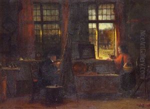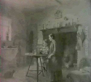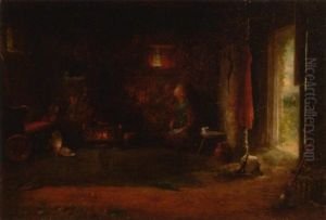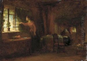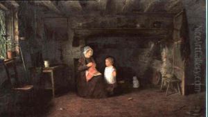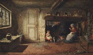 A Cottage Interior With A Girl Seated By The Fire
