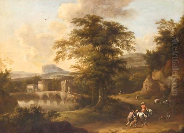 A Southern Landscape With A Horseman And Other Travellers Near A Bridge At Dusk