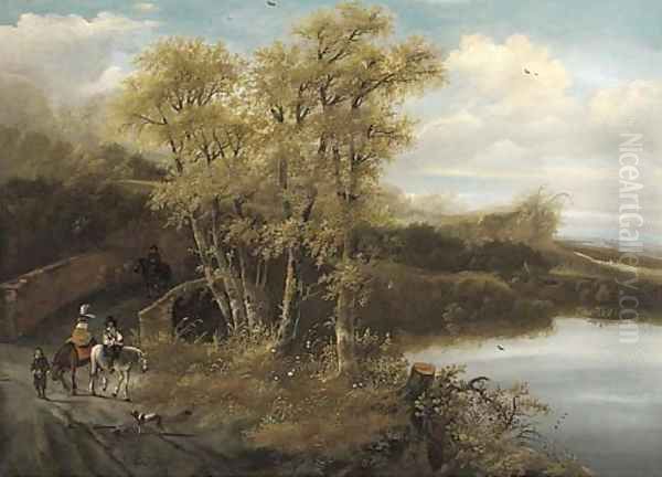 A wooded landscape with travellers crossing a bridge