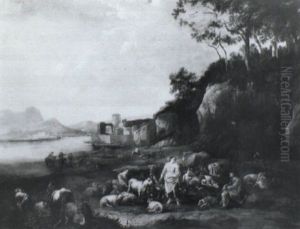 An Italianate Wooded River Landscape With Shepherds And Their Herd Of Goats In The Foreground