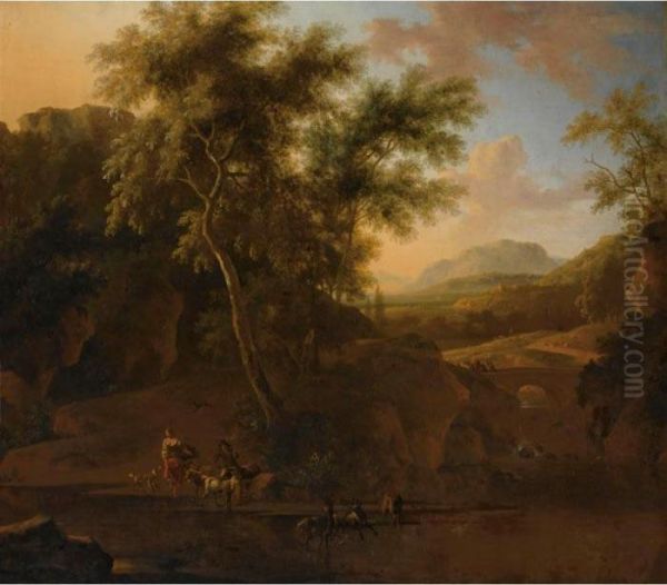 An Italianate Wooded River Landscape With Shepherds And Their Herd Of Goats In The Foreground, Two Travellers And A Donkey On The Bridge Beyond