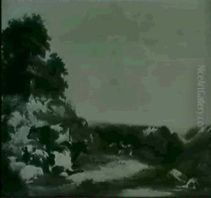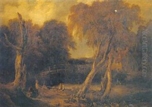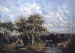 A Wooded River Landscape With Figures On A Bridge By A Watermill