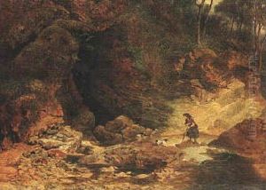 A Scottish Wooded River Landscape With Anglers On The Rocks