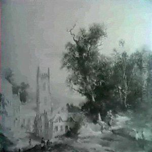 A Wooded River Landscape With Figures On A Bridge And A Building Beyond