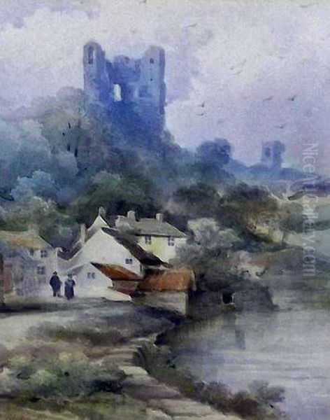 Riverside Village With Ruins Beyond
