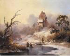 A Winter Landscape With Skaters, A Horse-drawn Cart On A Path Nearby
