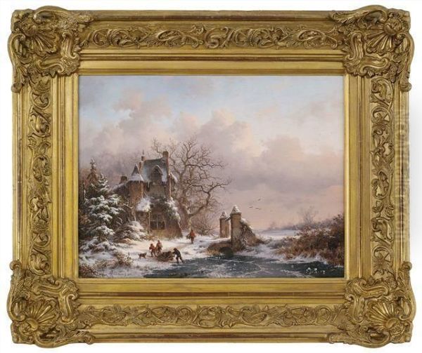 Abendliche Winterlandschaft Mit Einem Villenanwesen Und Holzsammlern