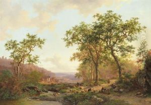 Summer Landscape With Figures And Cattle Near A Waterfall